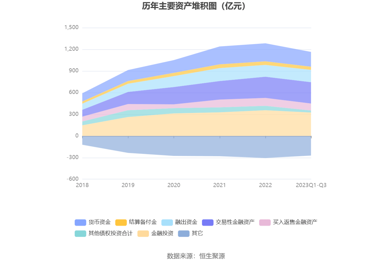 资产重大变化方面,截至2023年三季度末,公司其他债权投资合计较上年末减少54.64%,占公司总资产比重下降3.14个百分点;交易性金融资产较上年末增加0.56%,占公司总资产比重上升3.06个百分点;货币资金较上年末减少18.03%,占公司总资产比重下降2.61个百分点;融出资金较上年末增加4.12%,占公司总资产比重上升2.36个百分点。