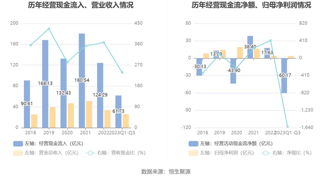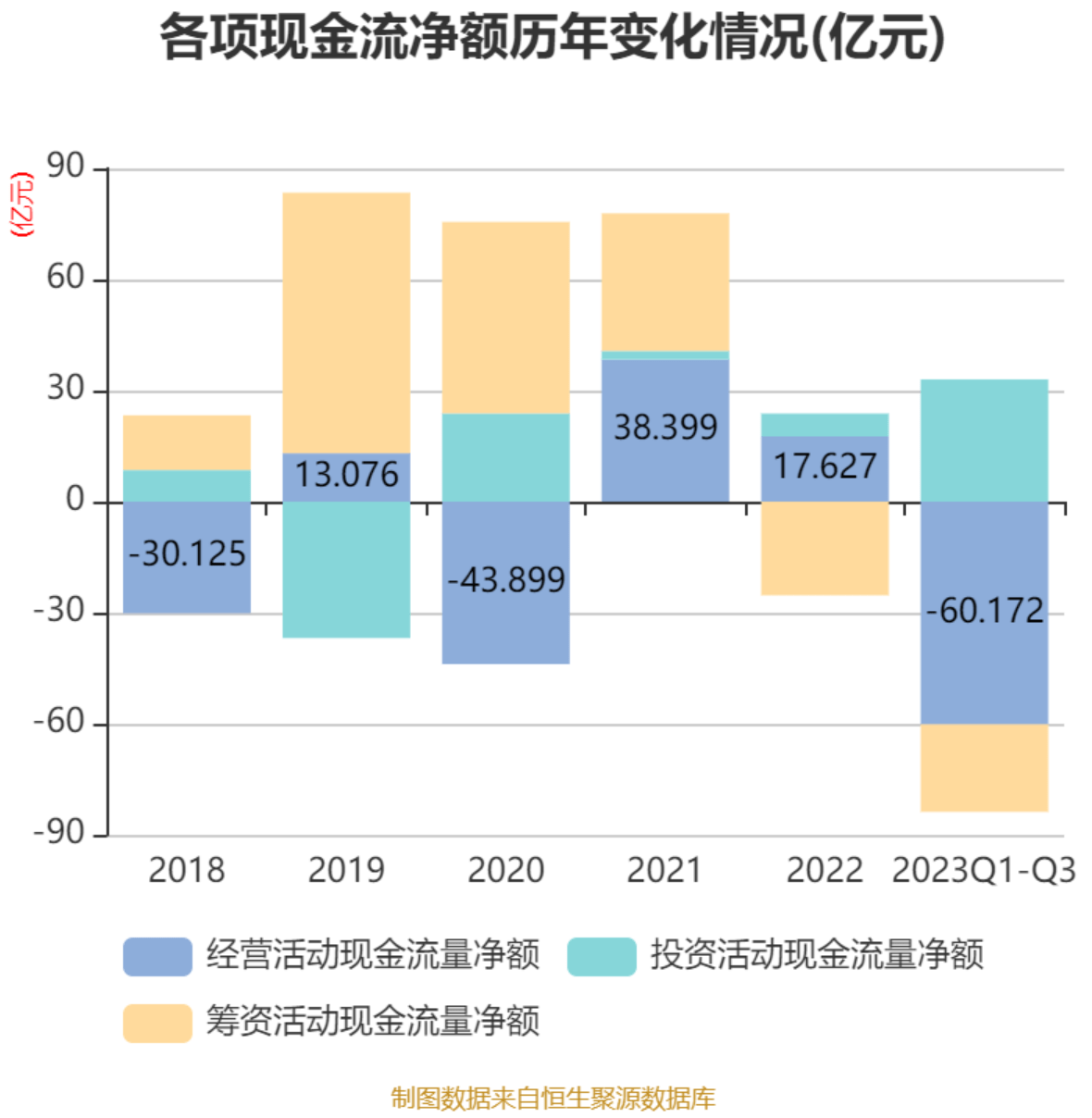 2023年前三季度,公司经营活动现金流净额为-60.17亿元,同比减少36.20亿元;筹资活动现金流净额-23.62亿元,同比增加1.43亿元;投资活动现金流净额33.02亿元,上年同期为29.07亿元。