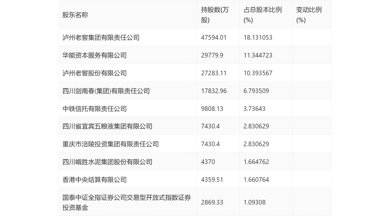 三季报显示,2023年三季度末公司十大流通股东中,持股最多的为泸州老窖集团有限责任公司,占比18.13%。十大流通股东名单相比2023年半年报维持不变。在具体持股比例上,泸州老窖股份有限公司、香港中央结算有限公司持股有所上升,国泰中证全指证券公司交易型开放式指数证券投资基金持股有所下降。
