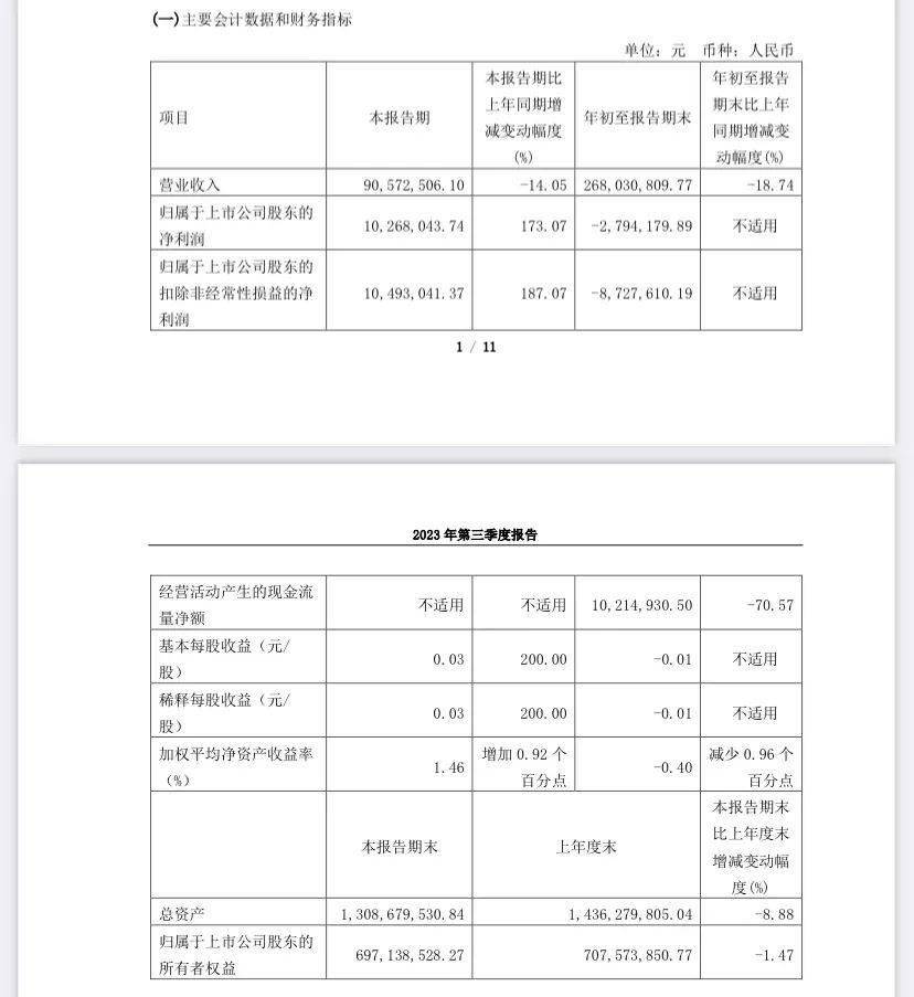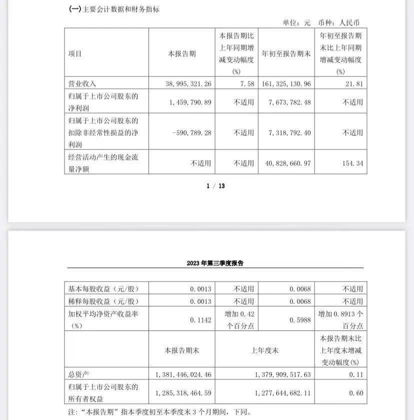10月27日,中葡股份发布三季报公告称,2023年前三季度实现营收1.61亿元,同比增长21.81%,净利润767万元。其中,第三季度营收14.6万元,同比增长7.58%;净利润亏损5.9万元。