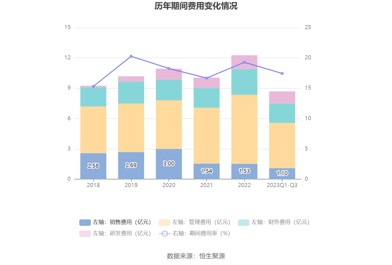 2023年前三季度,公司期间费用为8.70亿元,较上年同期增加6812.09万元;但期间费用率为17.44%,较上年同期下降1.79个百分点。其中,销售费用同比下降1.71%,管理费用同比下降2.61%,研发费用同比增长90.48%,财务费用同比增长15.03%。