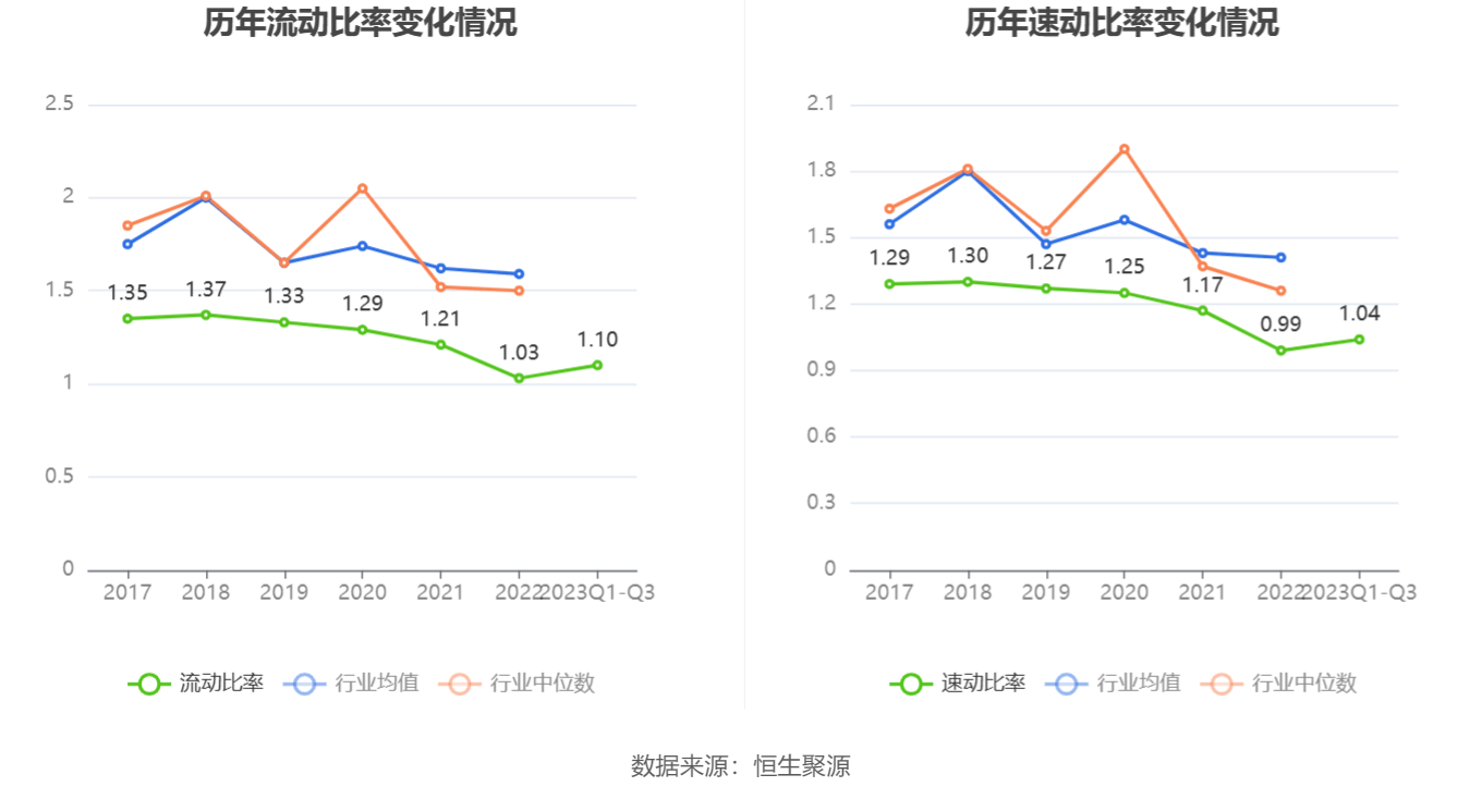 2023年前三季度,公司流动比率为1.10,速动比率为1.04。