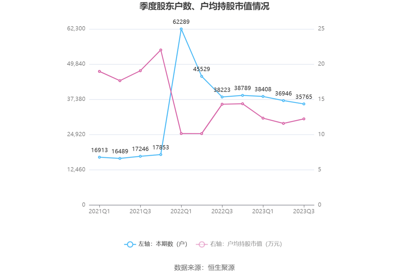 筹码集中度方面,截至2023年三季度末,公司股东总户数为3.58万户,较上半年末下降了1181户,降幅3.20%;户均持股市值由上半年末的11.59万元上升至12.23万元,增幅为5.52%。