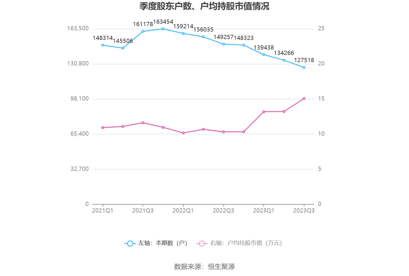 筹码集中度方面,截至2023年三季度末,公司股东总户数为12.75万户,较上半年末下降了6748户,降幅5.03%;户均持股市值由上半年末的13.22万元上升至15.07万元,增幅为13.99%。