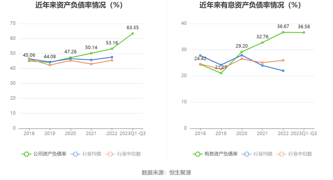 在偿债能力方面,公司2023年三季度末资产负债率为63.35%,相比上年末上升10.19个百分点;有息资产负债率为36.58%,相比上年末下降0.09个百分点。