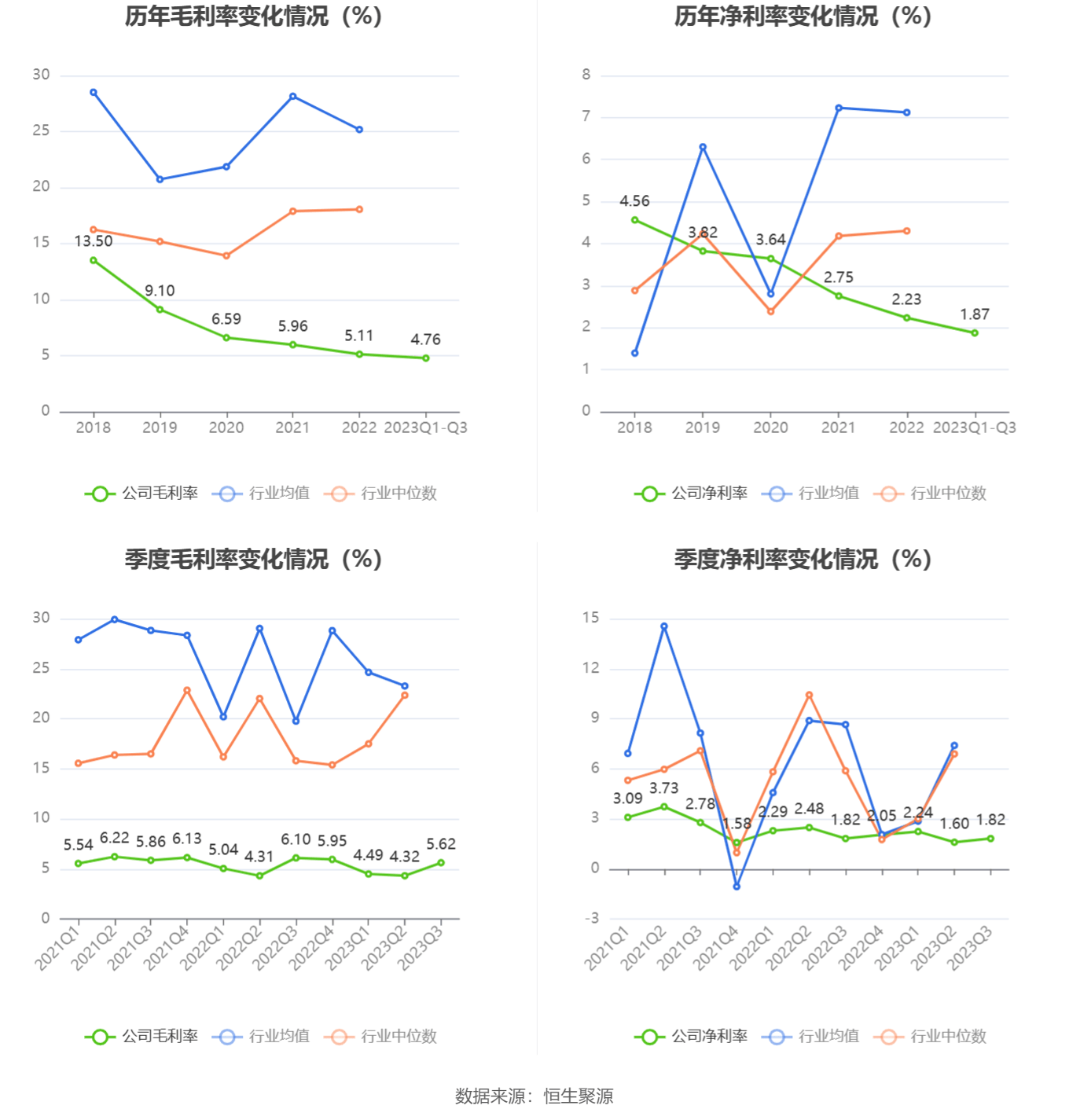 2023年前三季度,公司毛利率为4.76%,同比下降0.20个百分点;净利率为1.87%,较上年同期下降0.40个百分点。从单季度指标来看,2023年第三季度公司毛利率为5.62%,同比下降0.48个百分点,环比上升1.30个百分点;净利率为1.82%,较上年同期持平,较上一季度上升0.22个百分点。