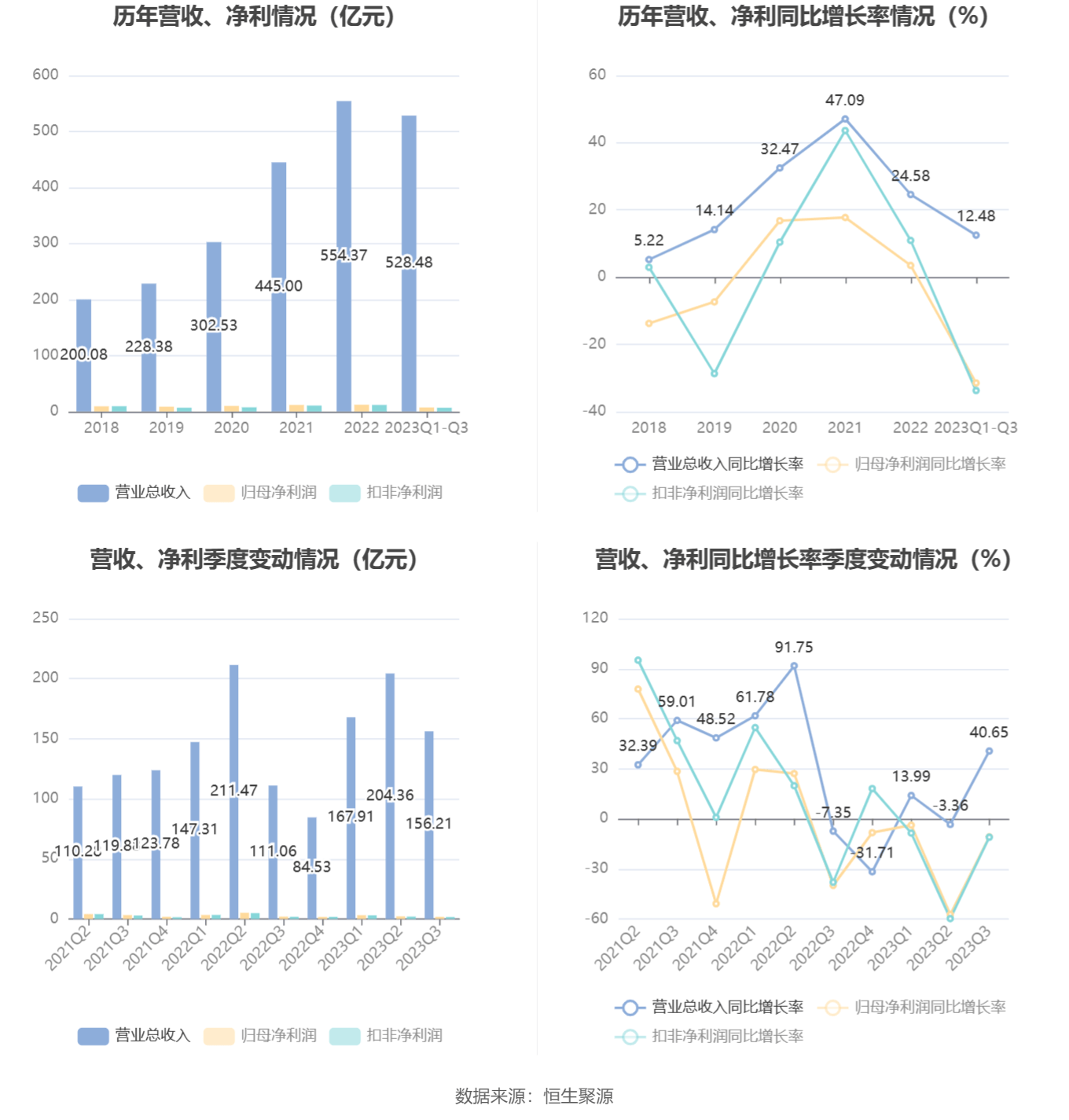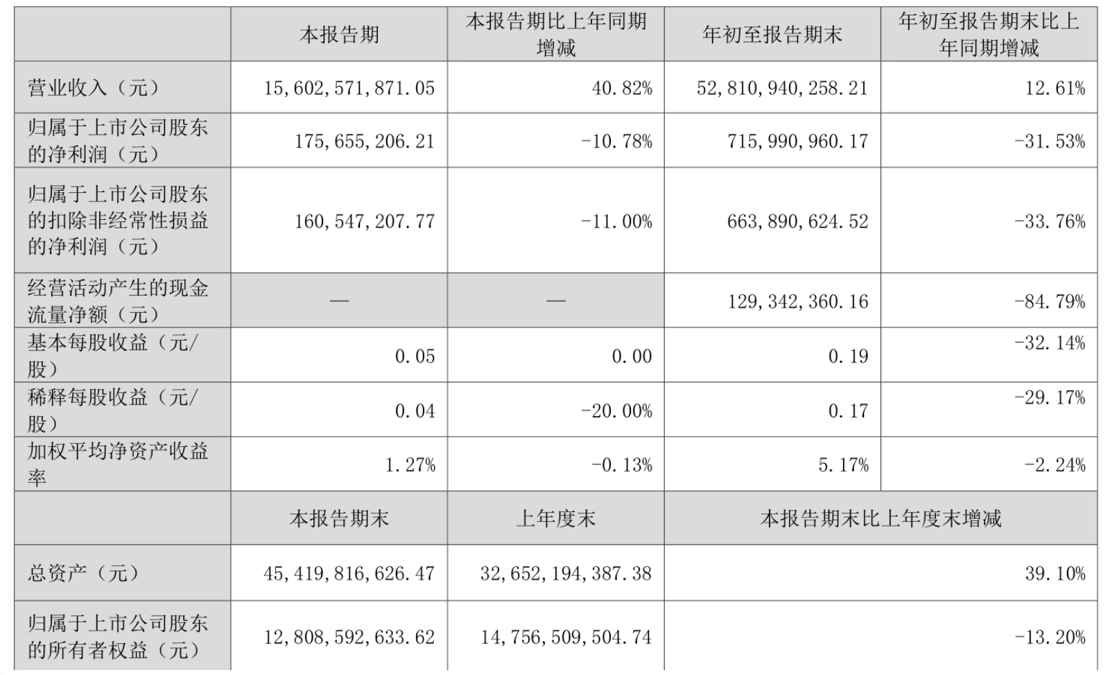 根据三季报,公司第三季度实现营业总收入156.21亿元,同比增长40.65%,环比下降23.56%;归母净利润1.76亿元,同比下降10.78%,环比下降20.23%;扣非净利润1.61亿元,同比下降11.00%,环比下降17.59%。