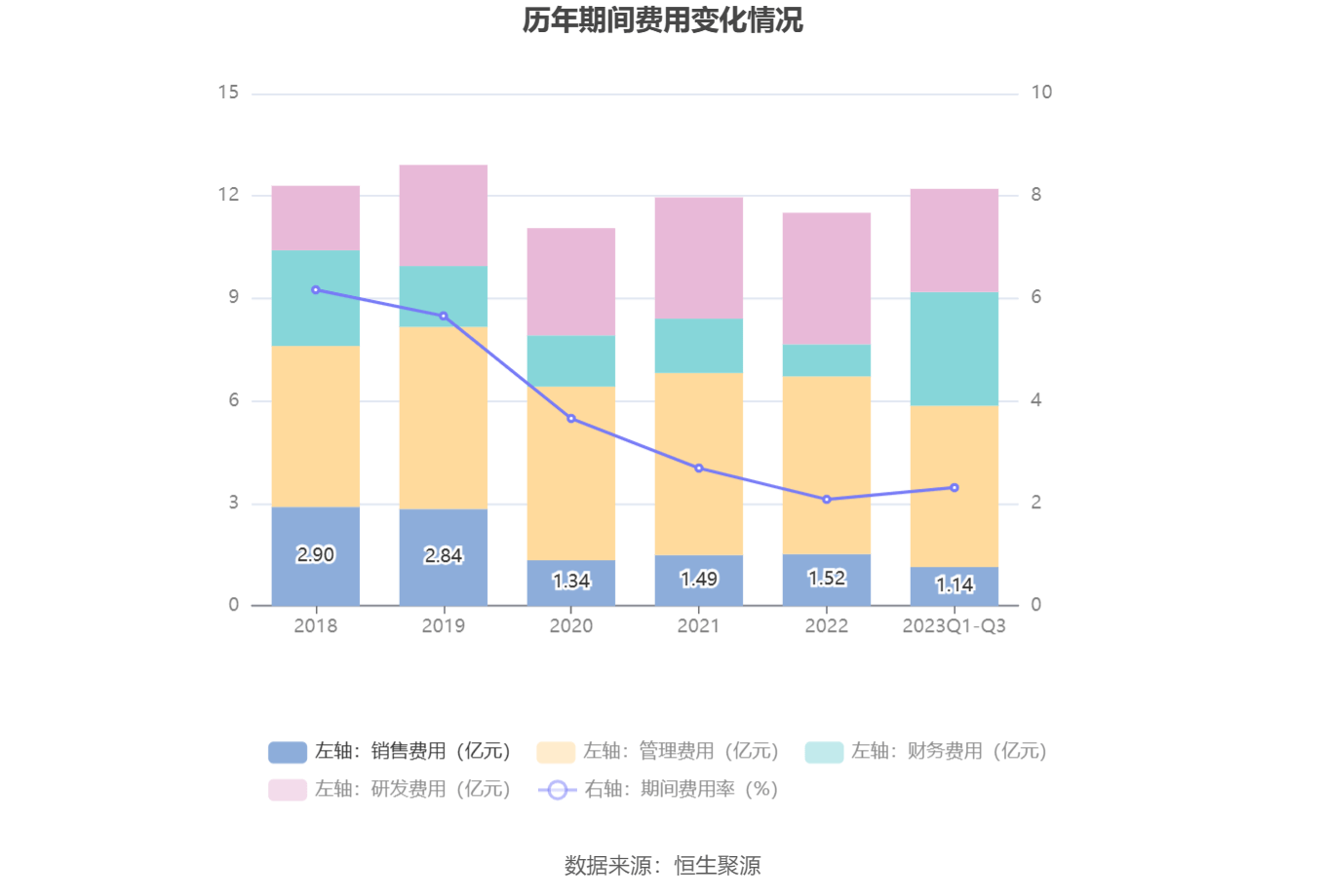 2023年前三季度,公司期间费用为12.21亿元,较上年同期增加3.01亿元;期间费用率为2.31%,较上年同期上升0.35个百分点。其中,销售费用同比增长6.01%,管理费用同比增长28.53%,研发费用同比增长12.94%,财务费用同比增长87.53%。