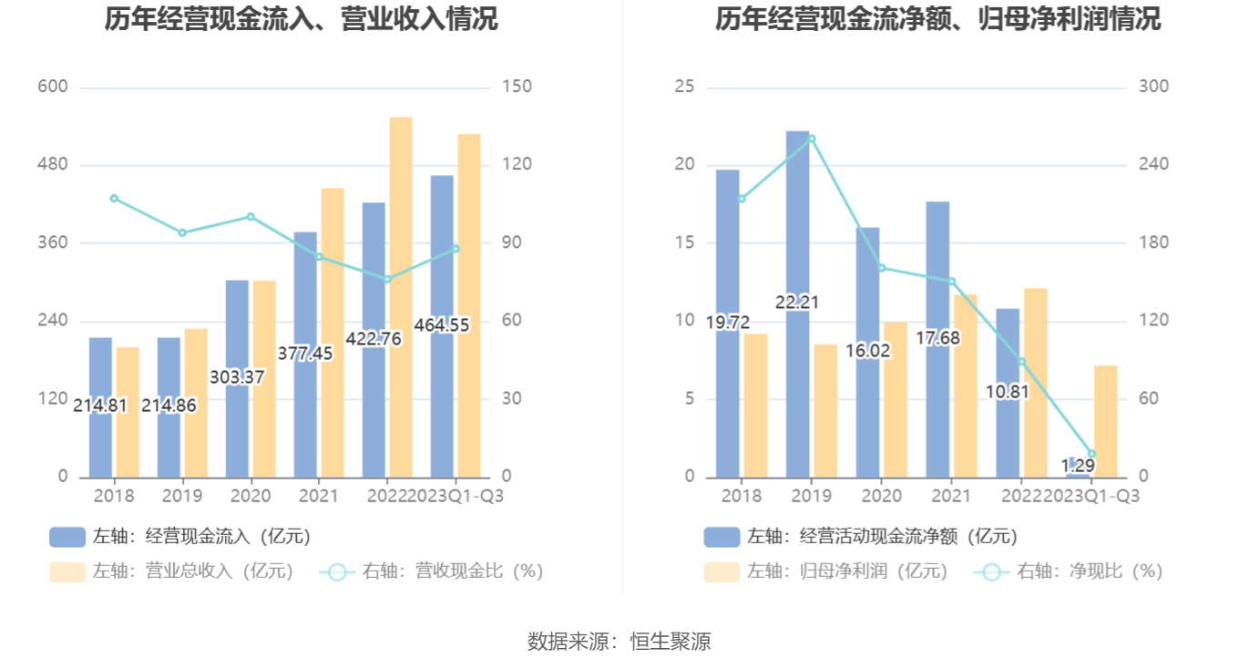 2023年前三季度,公司营业收入现金比为87.90%,净现比为18.06%。