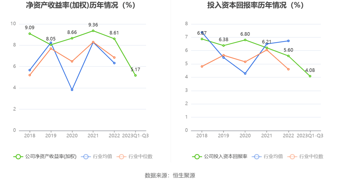 数据显示,2023年前三季度公司加权平均净资产收益率为5.17%,较上年同期下降2.24个百分点;公司2023年前三季度投入资本回报率为4.08%,较上年同期下降0.66个百分点。