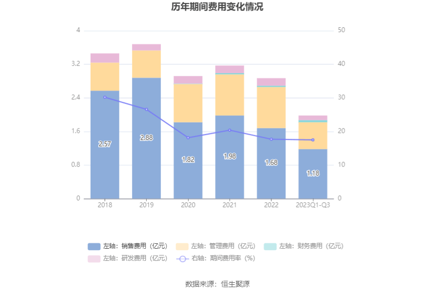 2023年前三季度,公司期间费用为1.98亿元,较上年同期增加947.01万元;期间费用率为17.49%,较上年同期上升0.24个百分点。其中,销售费用同比增长9.39%,管理费用同比下降5.42%,研发费用同比下降10.19%,财务费用同比增长391.23%。