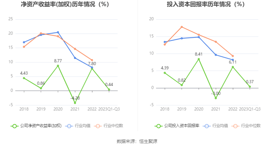 数据显示,2023年前三季度公司加权平均净资产收益率为0.44%,较上年同期下降6.20个百分点;公司2023年前三季度投入资本回报率为0.37%,较上年同期下降4.83个百分点。