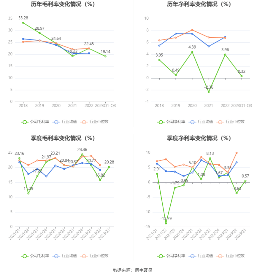 2023年前三季度,公司毛利率为19.14%,同比下降2.35个百分点;净利率为0.32%,较上年同期下降4.75个百分点。从单季度指标来看,2023年第三季度公司毛利率为20.28%,同比下降0.09个百分点,环比上升4.46个百分点;净利率为0.57%,较上年同期下降7.56个百分点,较上一季度上升4.20个百分点。