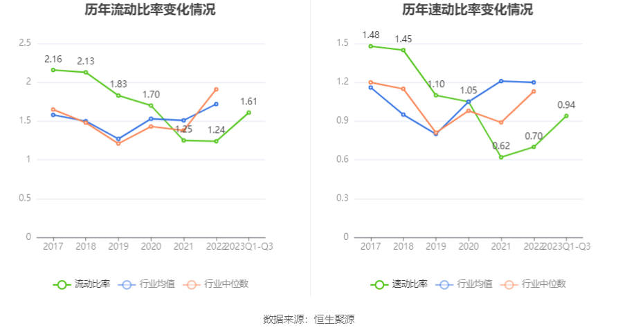 2023年前三季度,公司流动比率为1.61,速动比率为0.94。