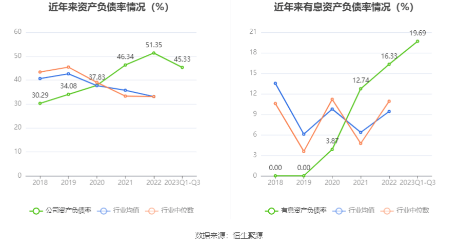 在偿债能力方面,公司2023年三季度末资产负债率为45.33%,相比上年末下降6.02个百分点;有息资产负债率为19.69%,相比上年末上升3.36个百分点。