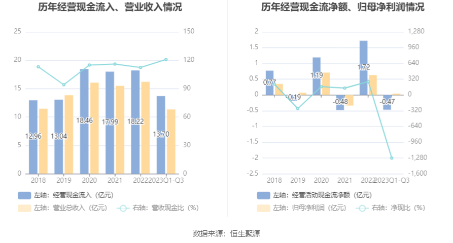2023年前三季度,公司营业收入现金比为120.84%,净现比为-1282.74%。