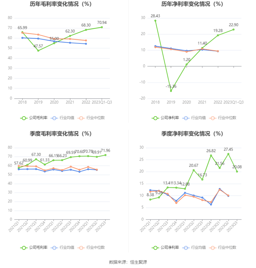 2023年前三季度,公司毛利率为70.94%,同比上升3.39个百分点;净利率为22.90%,较上年同期上升6.08个百分点。从单季度指标来看,2023年第三季度公司毛利率为71.96%,同比上升2.37个百分点,环比上升2.05个百分点;净利率为20.08%,较上年同期上升3.35个百分点,较上一季度下降7.37个百分点。