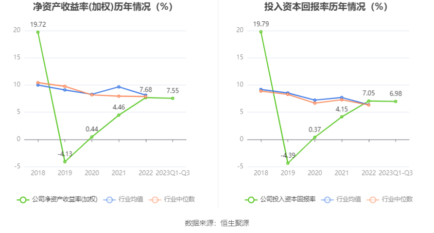 数据显示,2023年前三季度公司加权平均净资产收益率为7.55%,较上年同期增长2.43个百分点;公司2023年前三季度投入资本回报率为6.98%,较上年同期增长2.29个百分点。