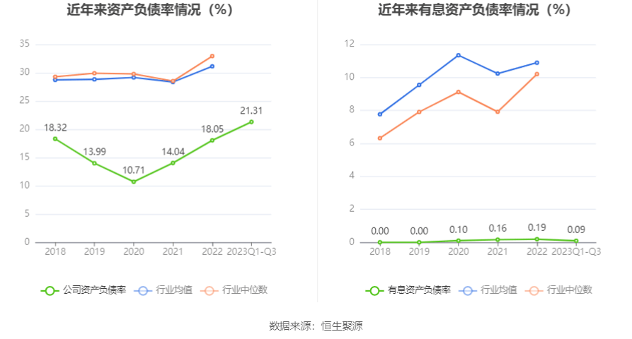 在偿债能力方面,公司2023年三季度末资产负债率为21.31%,相比上年末上升3.26个百分点;有息资产负债率为0.09%,相比上年末下降0.10个百分点。