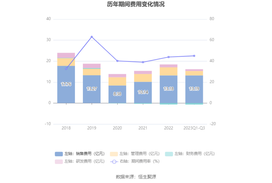 2023年前三季度,公司期间费用为15.44亿元,较上年同期增加1.29亿元;但期间费用率为45.05%,较上年同期下降1.40个百分点。其中,销售费用同比增长15.24%,管理费用同比下降5.63%,研发费用同比下降8.57%,财务费用由去年同期的-4581.00万元变为-7041.70万元。