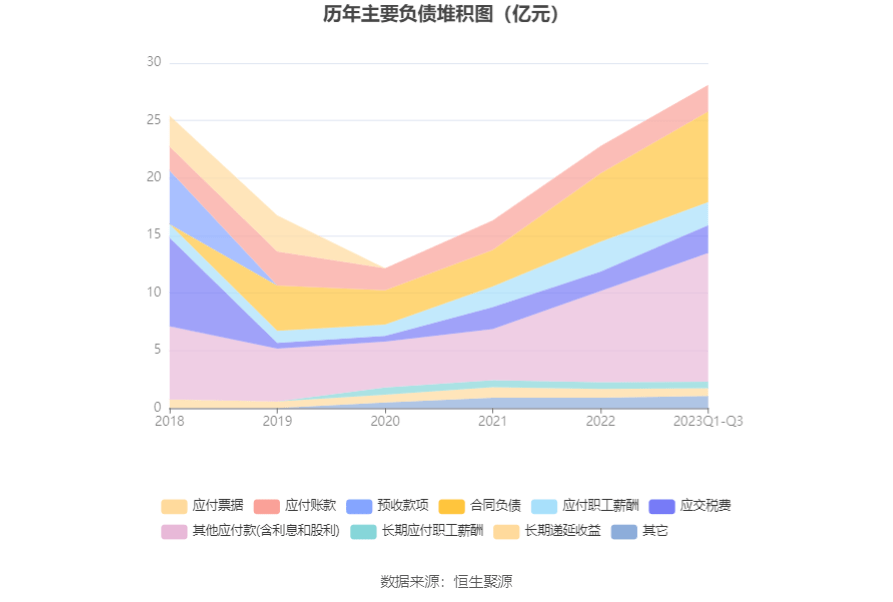负债重大变化方面,截至2023年三季度末,公司其他应付款(含利息和股利)较上年末增加40.83%,占公司总资产比重上升2.19个百分点;合同负债较上年末增加32.17%,占公司总资产比重上升1.26个百分点,主要系本期收到客户预收货款及应付客户返利增加影响;应交税费较上年末增加43.28%,占公司总资产比重上升0.50个百分点;应付职工薪酬较上年末减少22.17%,占公司总资产比重下降0.52个百分点。