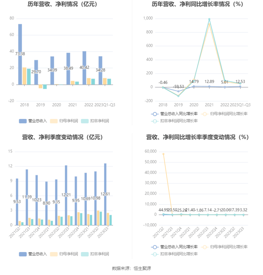 根据三季报,公司第三季度实现营业总收入12.61亿元,同比增长3.32%,环比增长14.85%;归母净利润2.53亿元,同比增长23.42%,环比下降16.03%;扣非净利润2.1亿元,同比增长13.51%,环比下降24.19%。