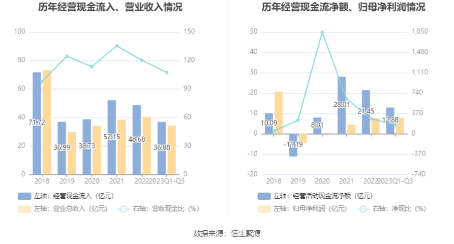 2023年前三季度,公司经营活动现金流净额为12.88亿元,同比下降0.04%;筹资活动现金流净额-7.62亿元,同比减少3.41亿元,主要系主要受本年分配股利较同期增长影响所致;投资活动现金流净额1.88亿元,上年同期为8542.81万元,主要系本期购买理财资金较同期减少所致。
