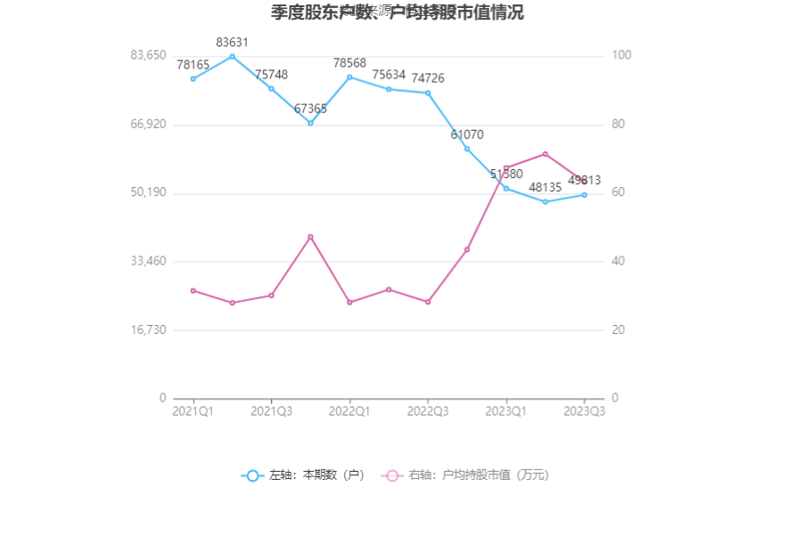 筹码集中度方面,截至2023年三季度末,公司股东总户数为4.98万户,较上半年末增长了1678户,增幅3.49%;户均持股市值由上半年末的71.51万元下降至63.42万元,降幅为11.31%。