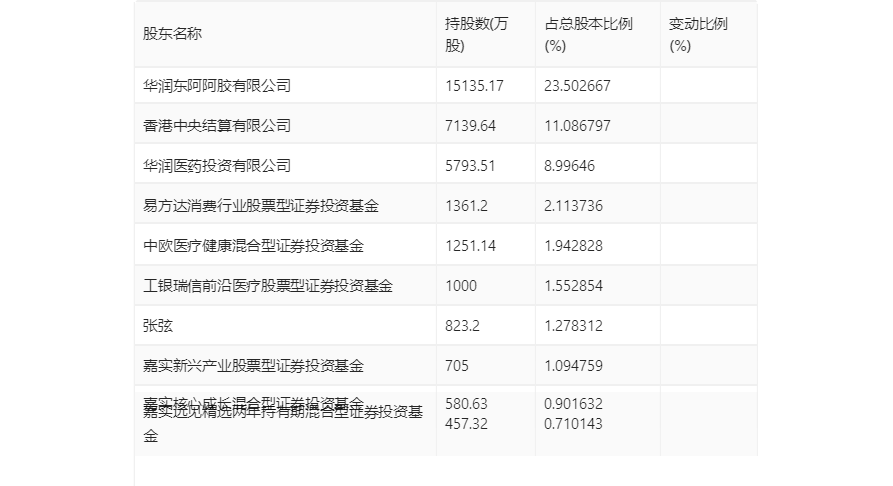 三季报显示,2023年三季度末公司十大流通股东中,持股最多的为华润东阿阿胶有限公司,占比23.50%。十大流通股东名单相比2023年半年报维持不变。在具体持股比例上,香港中央结算有限公司、易方达消费行业股票型证券投资基金、中欧医疗健康混合型证券投资基金、工银瑞信前沿医疗股票型证券投资基金、嘉实新兴产业股票型证券投资基金、嘉实核心成长混合型证券投资基金、嘉实远见精选两年持有期混合型证券投资基金持股有所上升。