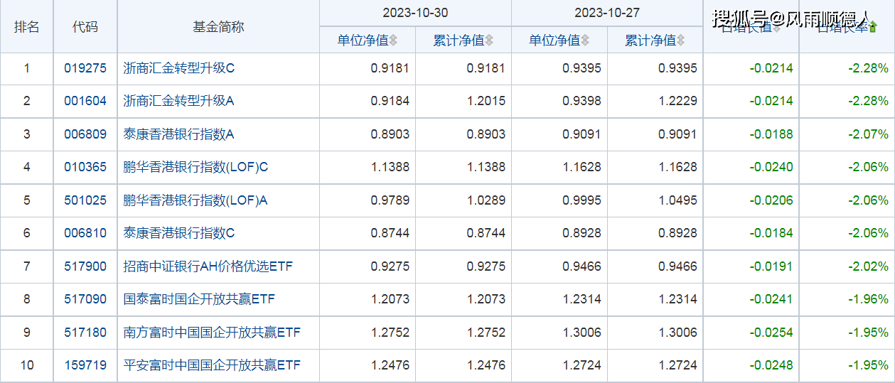 30日开放式基金净值增长排名后10的基金分别是:浙商汇金转型升级C、浙商汇金转型升级A、泰康香港银行指数A、鹏华香港银行指数(LOF)C、鹏华香港银行指数(LOF)A、泰康香港银行指数C、招商中证银行AH价格优选ETF、国泰富时国企开放共赢ETF、南方富时中国国企开放共赢ETF、平安富时中国国企开放共赢ETF。