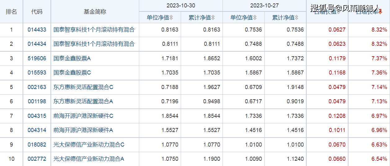 30日开放式基金净值增长排名前10的基金分别是:国泰智享科技1个月滚动持有混合发起A、国泰智享科技1个月滚动持有混合发起C、国泰金鑫股票A、国泰金鑫股票C、东方惠新灵活配置混合C、东方惠新灵活配置混合A、前海开源沪港深新硬件C、前海开源沪港深新硬件A、光大保德信产业新动力混合C、光大保德信产业新动力混合A。
