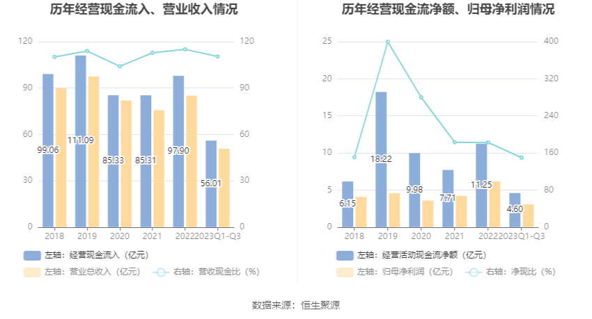2023年前三季度,公司营业收入现金比为110.42%,净现比为150.05%。