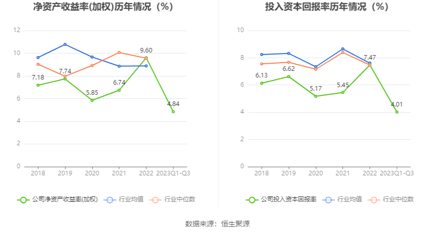 数据显示,2023年前三季度公司加权平均净资产收益率为4.84%,较上年同期下降4.38个百分点;公司2023年前三季度投入资本回报率为4.01%,较上年同期下降3.16个百分点。
