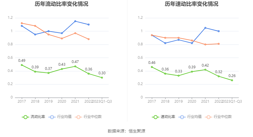 2023年前三季度,公司流动比率为0.30,速动比率为0.26。