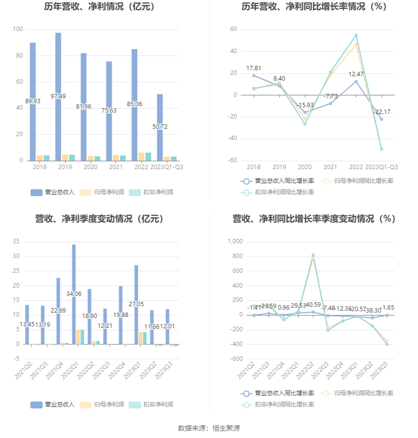 根据三季报,公司第三季度实现营业总收入12.01亿元,同比下降1.65%,环比增长2.93%;归母净利润-6092.7万元,同比下降354.73%,环比下降17.72%;扣非净利润-6263.37万元,同比下降400.03%,环比下降20.10%。