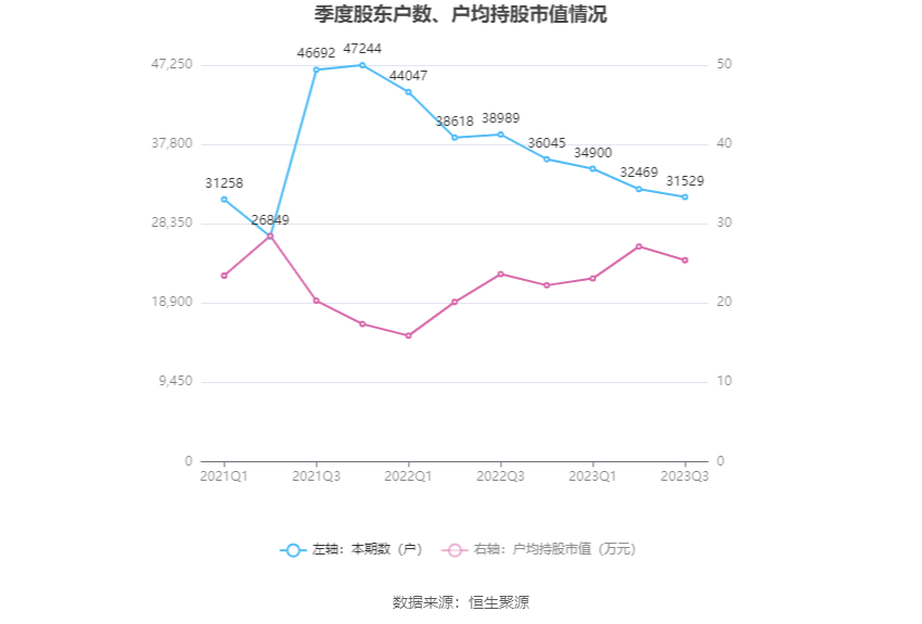 筹码集中度方面,截至2023年三季度末,公司股东总户数为3.15万户,较上半年末下降了940户,降幅2.90%;户均持股市值由上半年末的27.13万元下降至25.40万元,降幅为6.38%。
