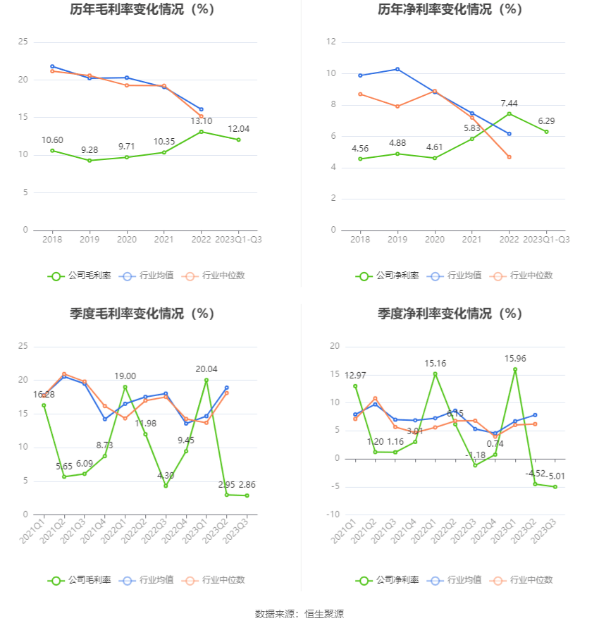 2023年前三季度,公司毛利率为12.04%,同比下降2.17个百分点;净利率为6.29%,较上年同期下降3.20个百分点。从单季度指标来看,2023年第三季度公司毛利率为2.86%,同比下降1.44个百分点,环比下降0.09个百分点;净利率为-5.01%,较上年同期下降3.83个百分点,较上一季度下降0.49个百分点。