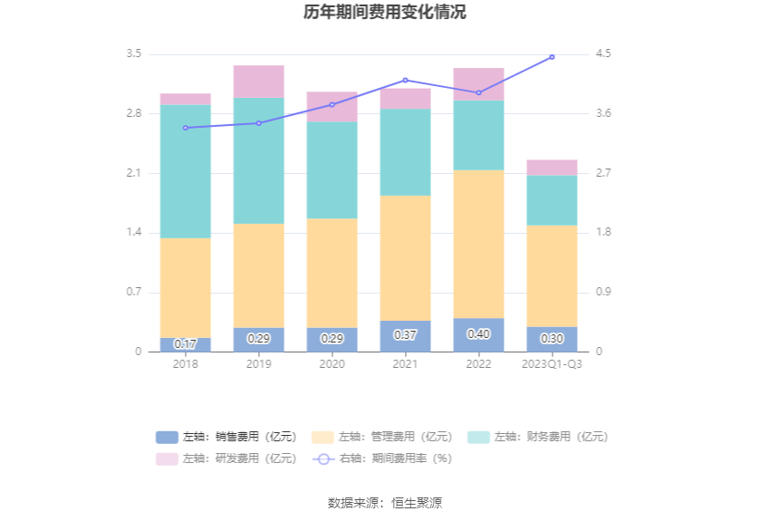 2023年前三季度,公司期间费用为2.26亿元,较上年同期增加1651.75万元;期间费用率为4.46%,较上年同期上升1.24个百分点。其中,销售费用同比增长8.14%,管理费用同比增长12.53%,研发费用同比增长12.54%,财务费用同比下降1.75%。