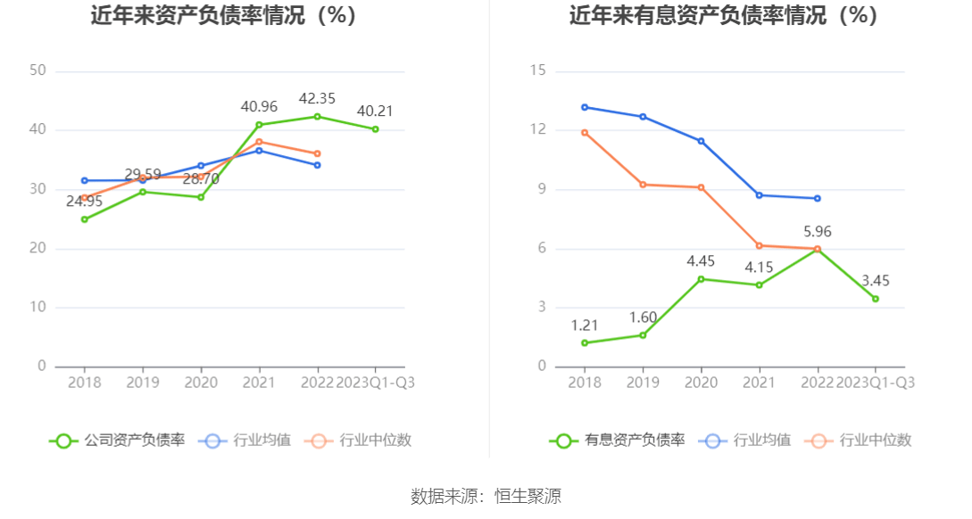 在偿债能力方面,公司2023年三季度末资产负债率为40.21%,相比上年末下降1.53个百分点;有息资产负债率为3.45%,相比上年末下降2.51个百分点。