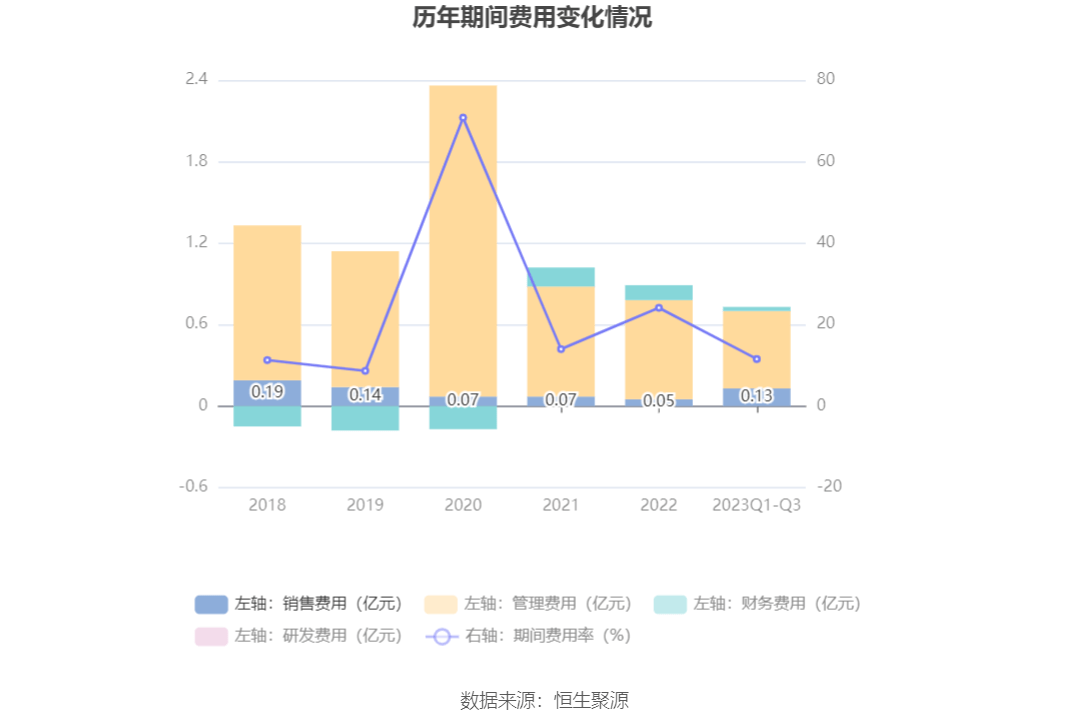 2023年前三季度,公司期间费用为7267.36万元,较上年同期增加341.64万元;但期间费用率为11.55%,较上年同期下降9.16个百分点。其中,销售费用同比增长3.13%,管理费用同比增长21.77%,财务费用同比下降73.6%。