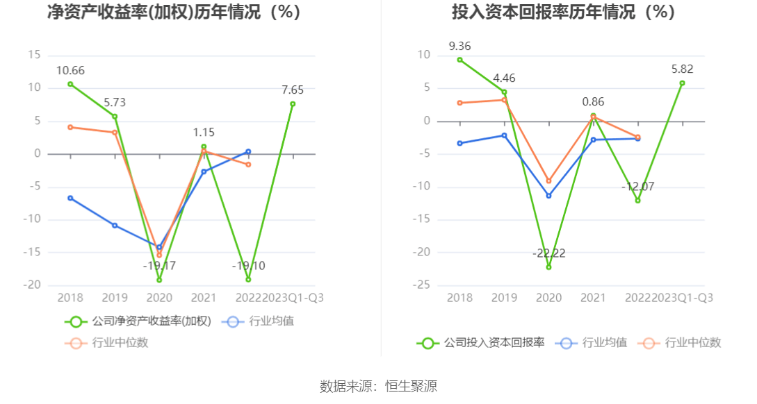 数据显示,2023年前三季度公司加权平均净资产收益率为7.65%,较上年同期增长16.38个百分点;公司2023年前三季度投入资本回报率为5.82%,较上年同期增长10.96个百分点。