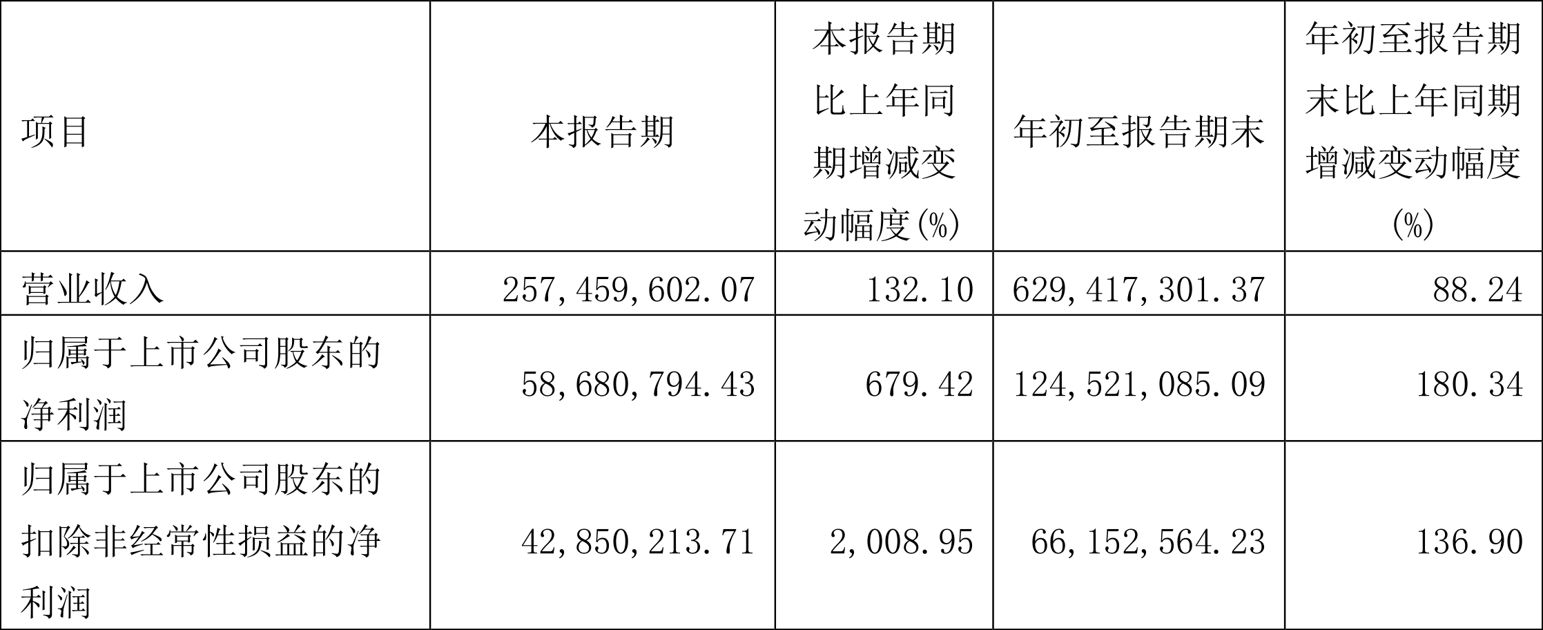 根据三季报,公司第三季度实现营业总收入2.57亿元,同比增长132.10%,环比增长32.43%;归母净利润5868.08万元,同比增长679.42%,环比增长96.49%;扣非净利润4285.02万元,同比增长2008.95%,环比增长13965.71%。