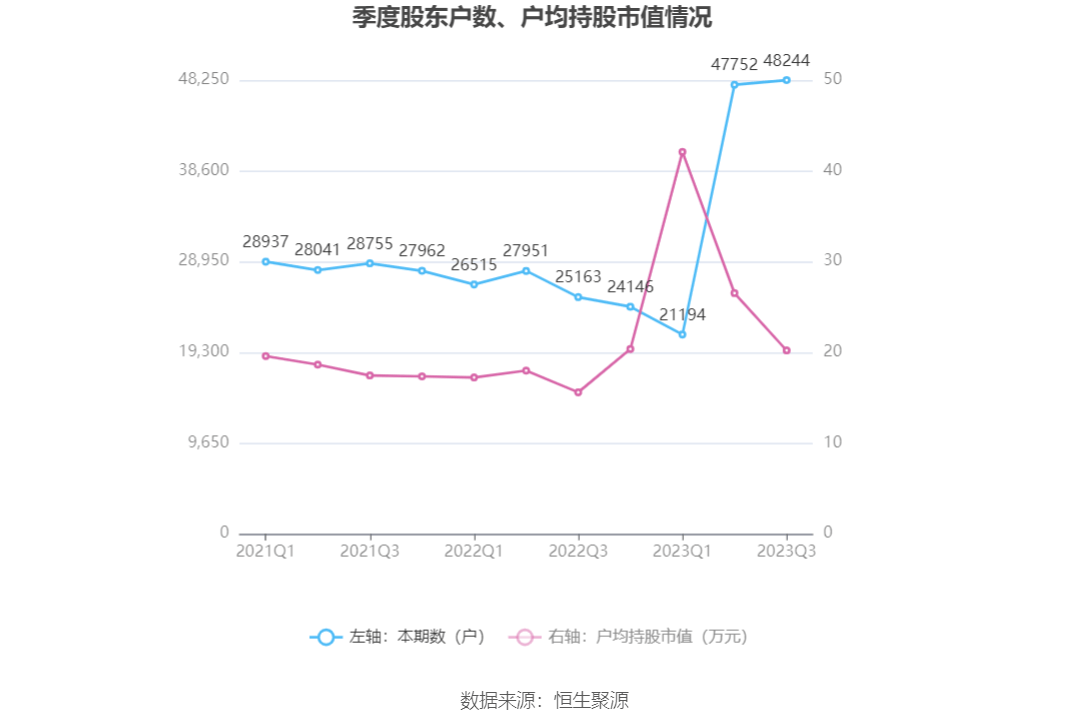 筹码集中度方面,截至2023年三季度末,公司股东总户数为4.82万户,较上半年末增长了492户,增幅1.03%;户均持股市值由上半年末的26.52万元下降至20.20万元,降幅为23.83%。