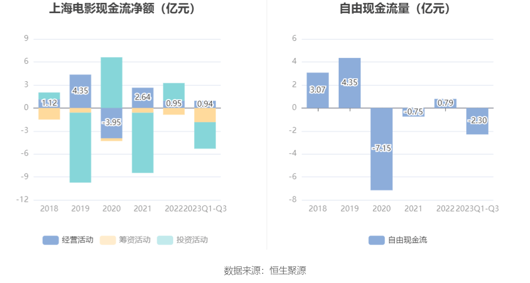 2023年前三季度,公司经营活动现金流净额为9430.95万元,同比增长434.44%,主要系报告期内控股影院营业收入提升,且加强应收款项目常管理所致;筹资活动现金流净额-1.85亿元,同比减少1.78亿元;投资活动现金流净额-3.46亿元,上年同期为1.28亿元。