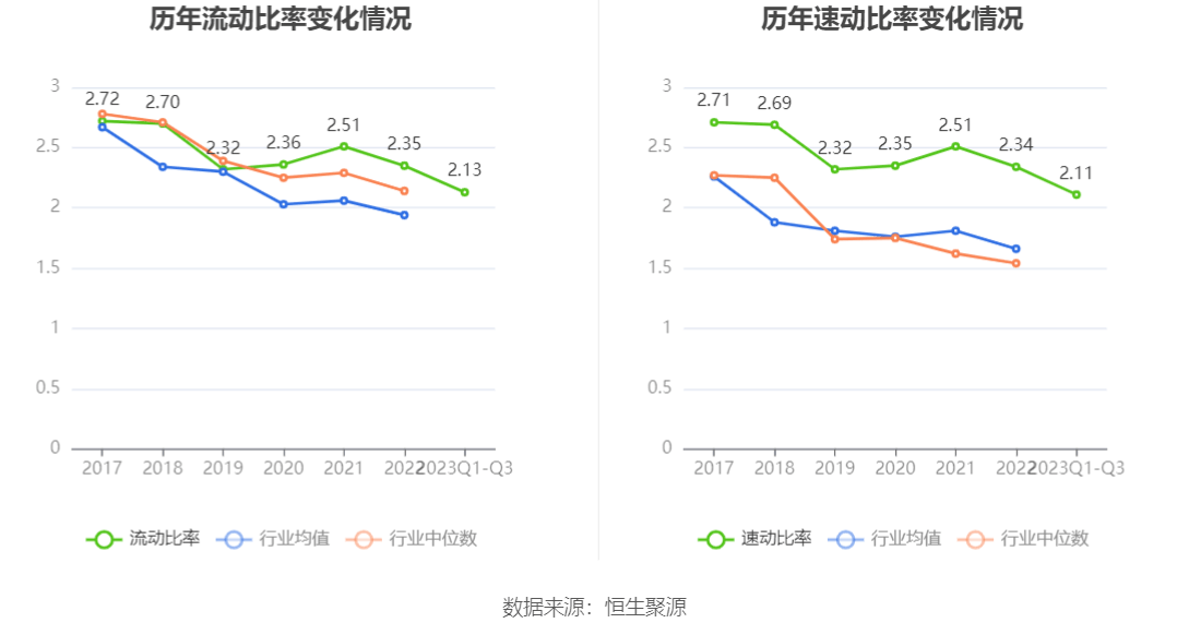 2023年前三季度,公司流动比率为2.13,速动比率为2.11。