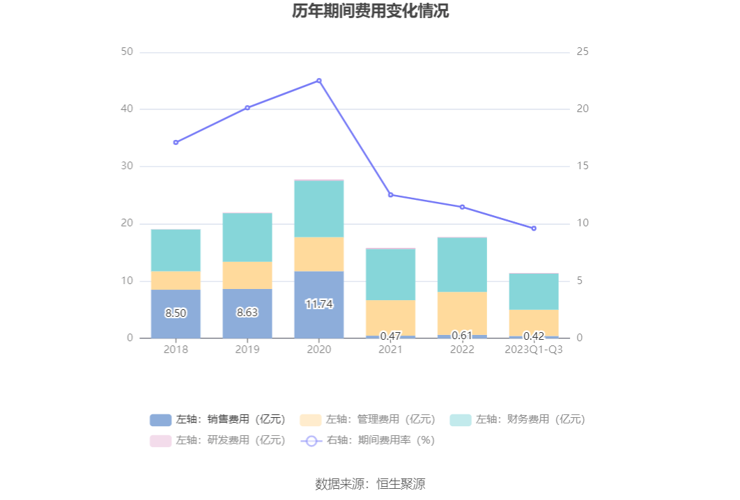 2023年前三季度,公司期间费用为11.42亿元,较上年同期减少1.60亿元;期间费用率为9.61%,较上年同期下降2.31个百分点。其中,销售费用同比下降16.86%,管理费用同比下降1.3%,研发费用同比下降28.28%,财务费用同比下降18.31%。