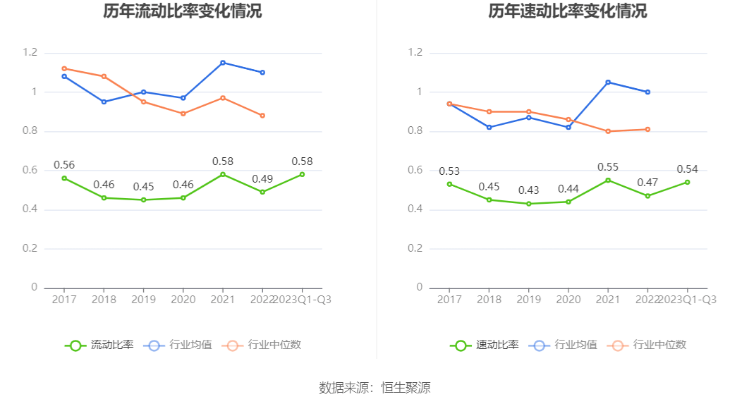 2023年前三季度,公司流动比率为0.58,速动比率为0.54。