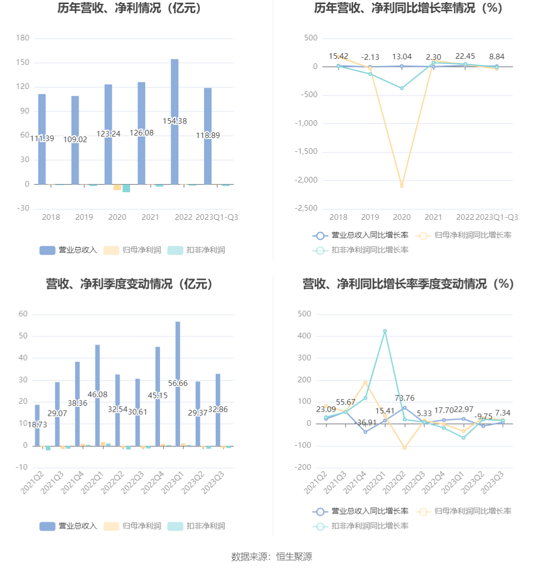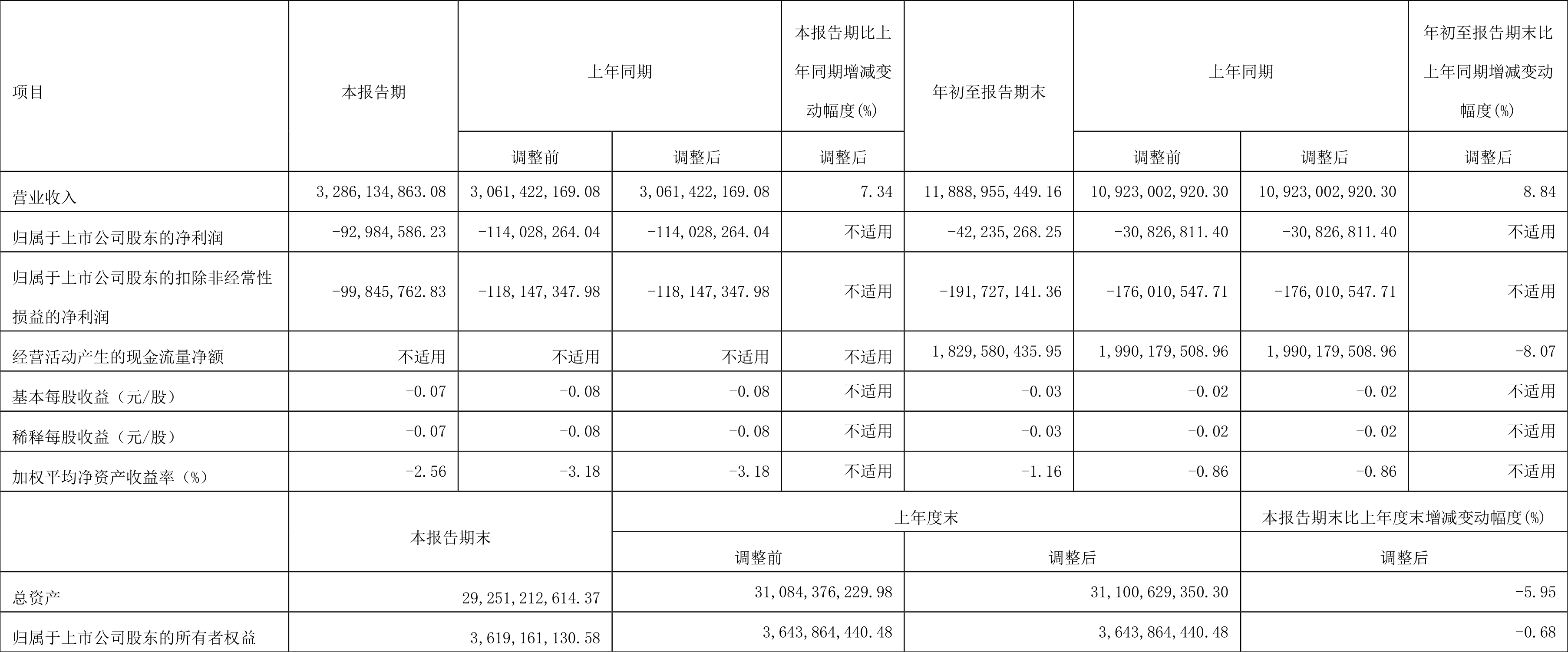 根据三季报,公司第三季度实现营业总收入32.86亿元,同比增长7.34%,环比增长11.90%;归母净利润-9298.46万元,同比增长18.45%,环比下降40.60%;扣非净利润-9984.58万元,同比增长15.49%,环比增长23.92%。