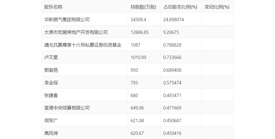 三季报显示,2023年三季度末公司十大流通股东中,新进股东为靖戈共赢尊享十六号私募证券投资基金、香港中央结算有限公司,取代了上半年末的靖戈共赢尊享十二号私募证券投资基金、广金美好薛定谔十八号私募证券投资基金。在具体持股比例上,华新燃气集团有限公司持股有所上升。