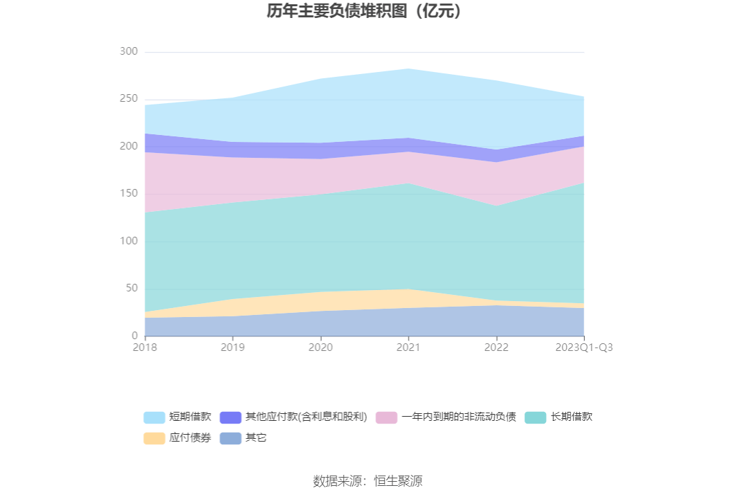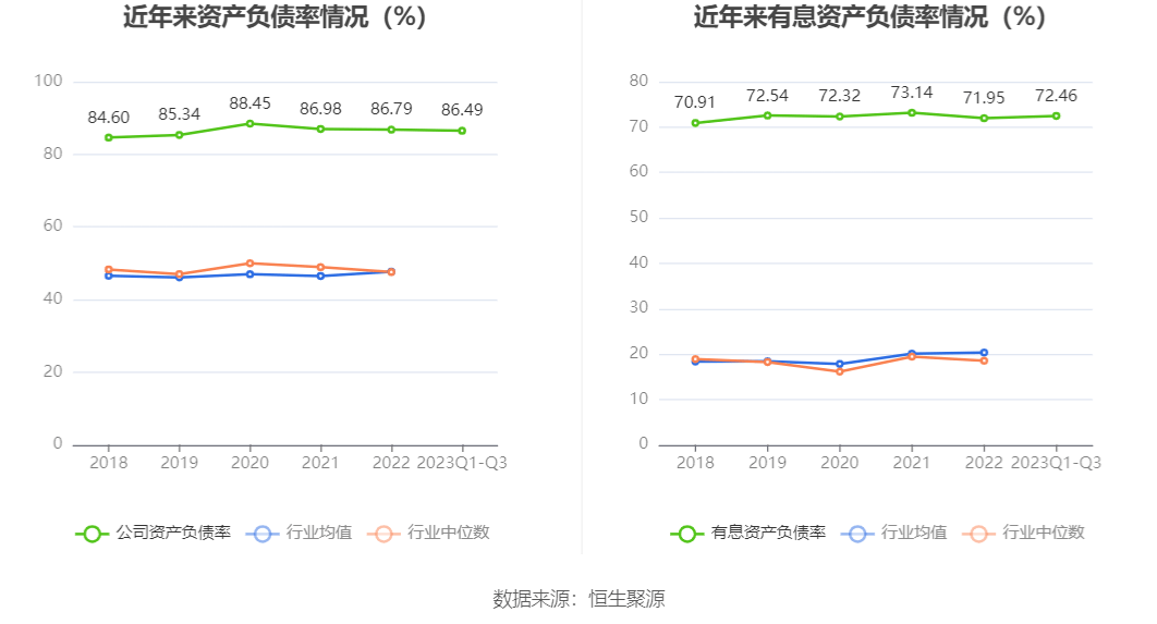 在偿债能力方面,公司2023年三季度末资产负债率为86.49%,相比上年末下降0.31个百分点;有息资产负债率为72.46%,相比上年末上升0.51个百分点。